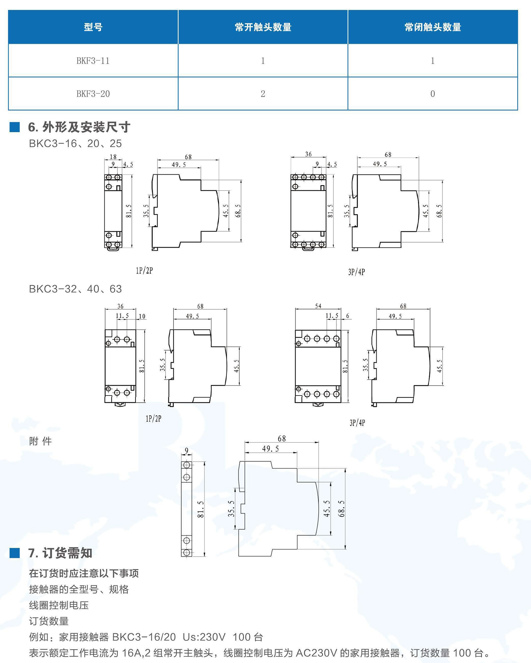 BKC3系列家用接触器适用于交流50Hz,额定工作电压至400V,使用类别 AC-7a下的额定工作电流至63A,用于控制家用及类似用途的低感或微感负载,也可以用于控制家用电动机负载。本产品应用于宾馆、公寓等场所,实现自动化控制功能。产品符合GB/T 17885、IEC 61095标准。